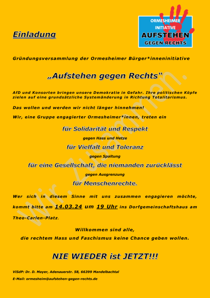 Die acht Gründungsmitglieder unserer Initiative hatten bei der Gründungsversammlung auf regen Zuspruch gehofft, das aber hatten sie nicht erwartet: Der große Versammlungsraum im Dorfgemeinschaftshaus wurde proppenvoll! Über 70 Bürger:innen aus Ormesheim und den umliegenden Orten waren gekommen, um sich über die Arbeit und Pläne unserer Initiative zu informieren. Nach einem anregenden Austausch über Motive, Erfahrungen und Ideen zum konstruktiven Widerstand gegen Rechtsradikalismus hat die Initiative nunmehr nicht nur 8, sondern über 50 Mitglieder.